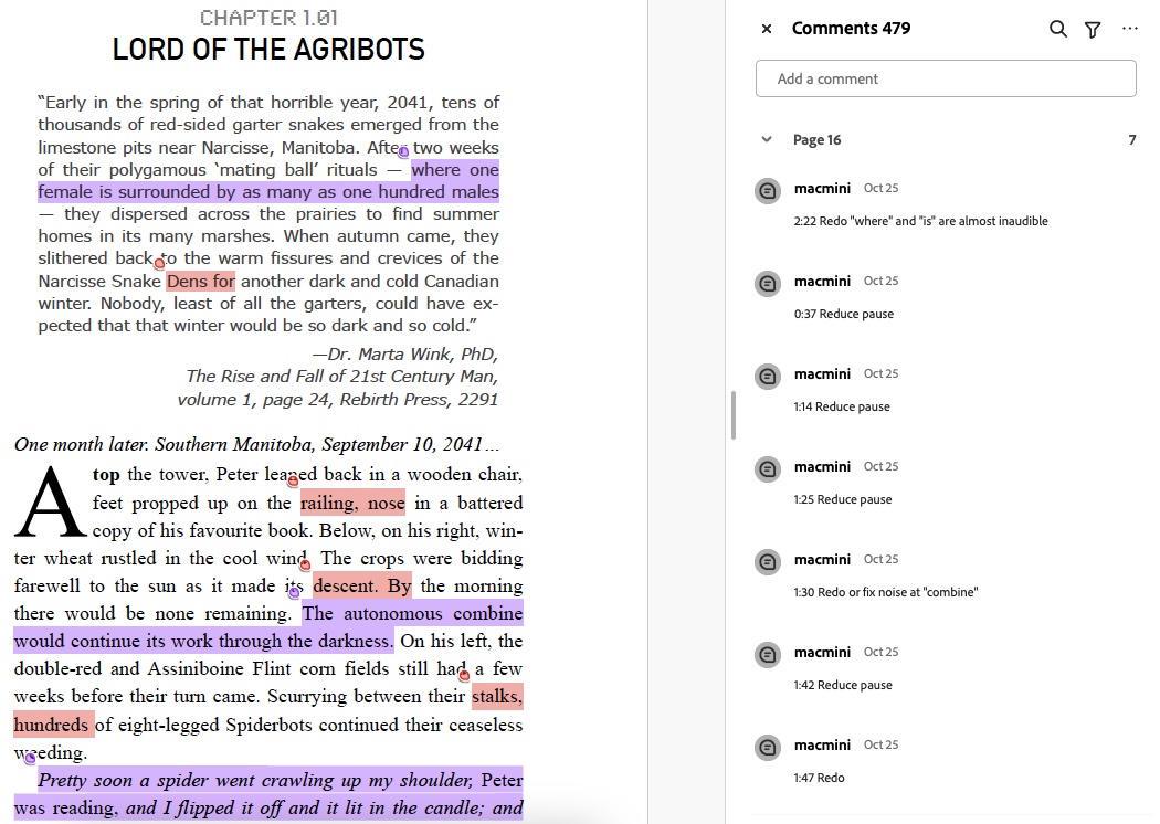 I'm slowly nearing the finish line with the making of the audiobook version of All the Humans Are Sleeping. All 327 pages have been recorded in a local studio used by Penguin Books Canada. I finished listening to the audio proofs this weekend, making notes in the manuscript of 479 edits and retakes we need to make.