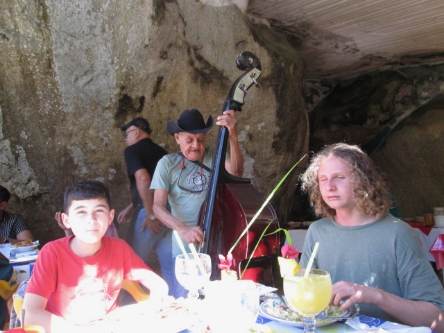 Afterwards, we headed to the adjacent restaurant, which was built into the mountainside. While we waited an ol' Mexican, with a hoarse voice, sang us a song, while tapping (not playing) his cello. Like the alien who greeted us, we tipped him to leave us alone...