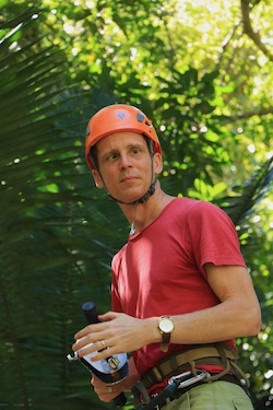 Despite the food poisoning, the gruesome washroom and the ghoulish ET, the actual ziplining experience was fantastic. We hiked up the mountainside with two guides. Here's one of them flying through the junglescape with my blind son (who otherwise wouldn't know when to break).