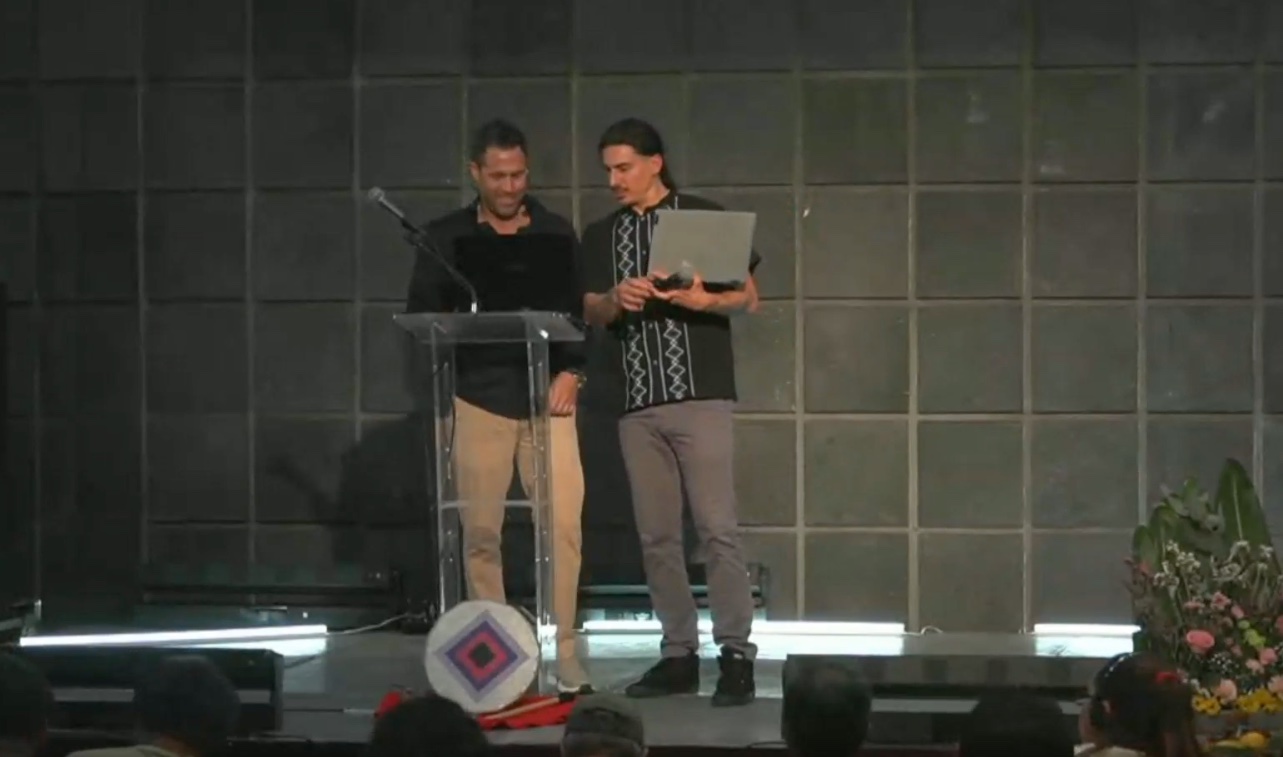 Here he is on stage, being introduced by Derrick Broze: